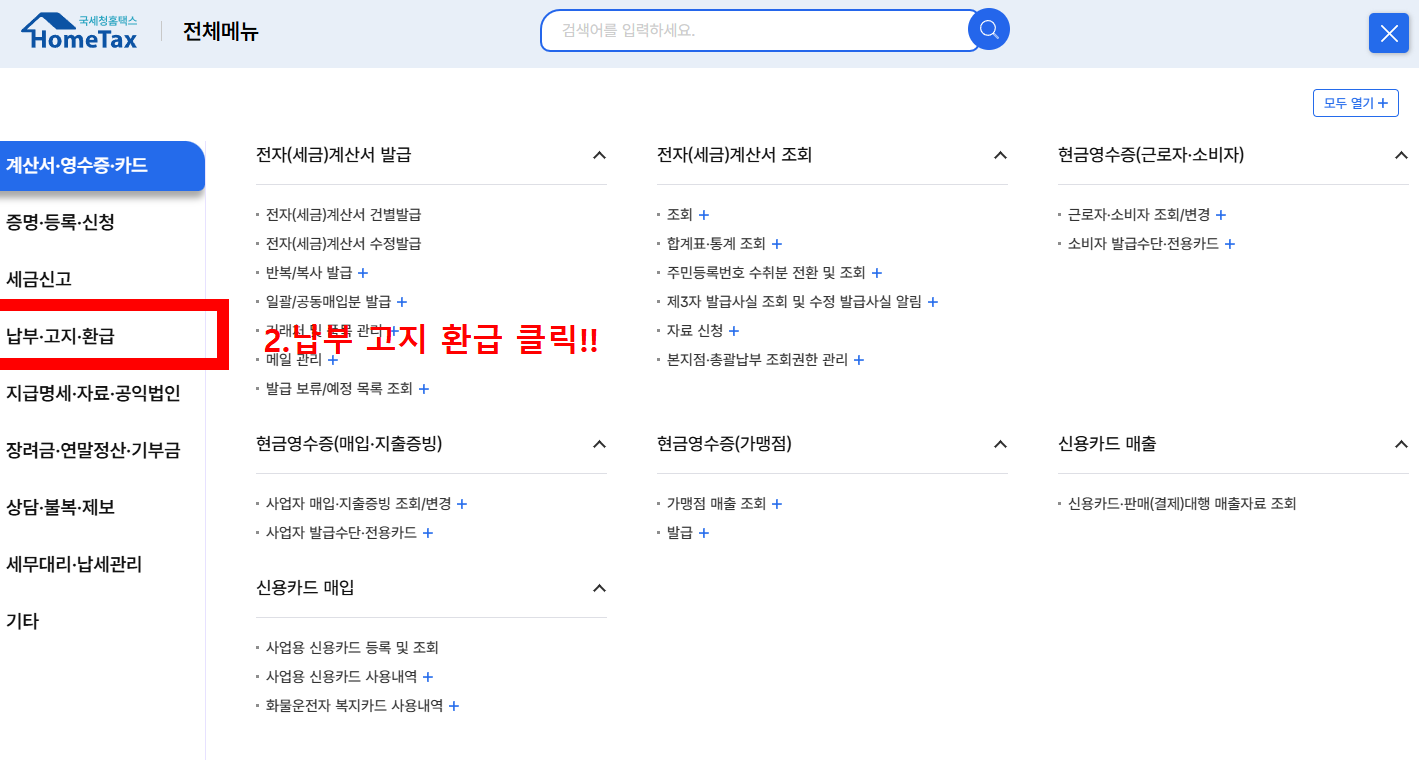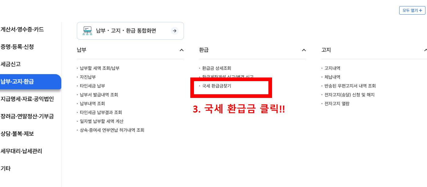 - [납부·고지·환급] → [국세환급금 찾기] 메뉴 선택